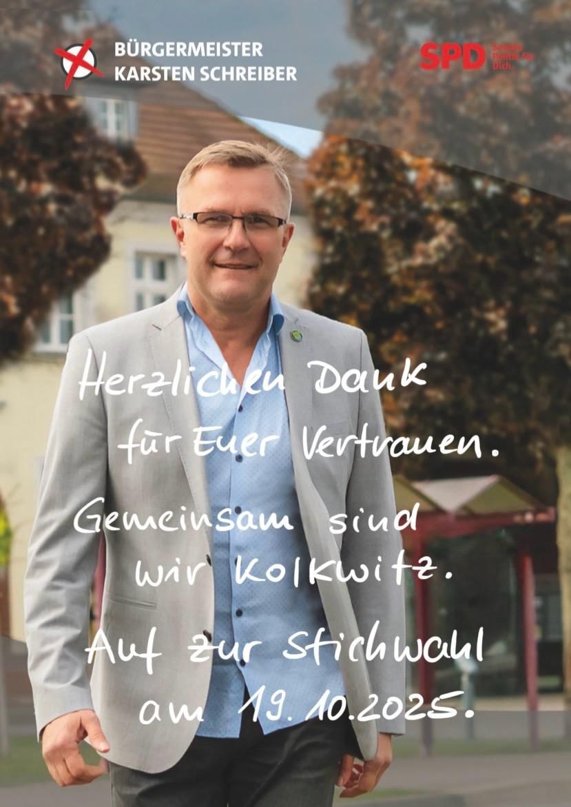 Karsten Schreiber zieht in die Stichwahl ein. Am 19.Oktober entscheiden die Kolkwitzerinnen und Kolkwitzer über ihr Stadtoberhaupt.